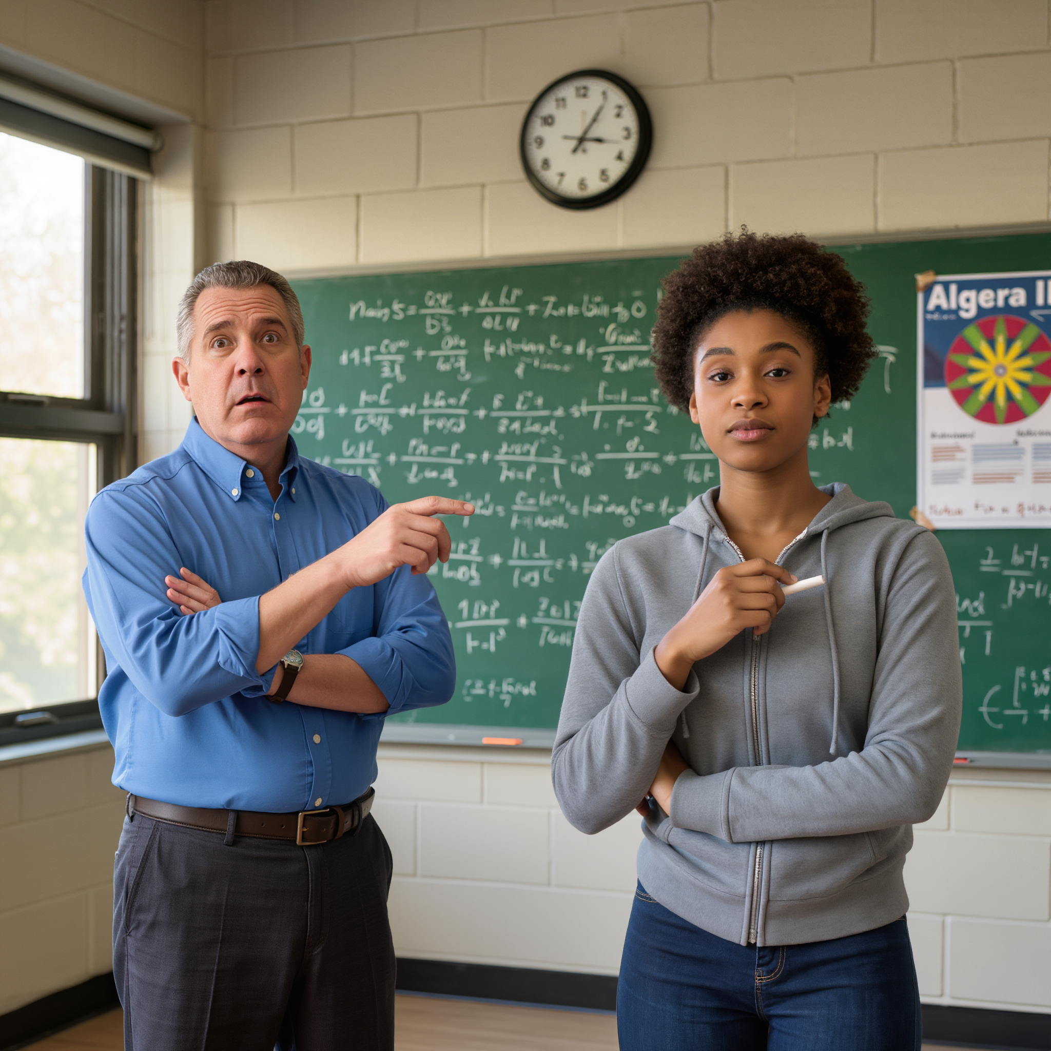 The classroom was silent except for the sound of chalk whispering over the board. Fluorescent lights hummed faintly above rows of laminate desks; outside the tall windows, a flag on the yard pole hung limp in the late‑morning air. Mr. Reynolds — a strict, famously condescending math teacher whose tie knots were as tight as his smile — turned around, his smirk widening as he eyed Maya, the quiet girl sitting in the back row by the radiator.