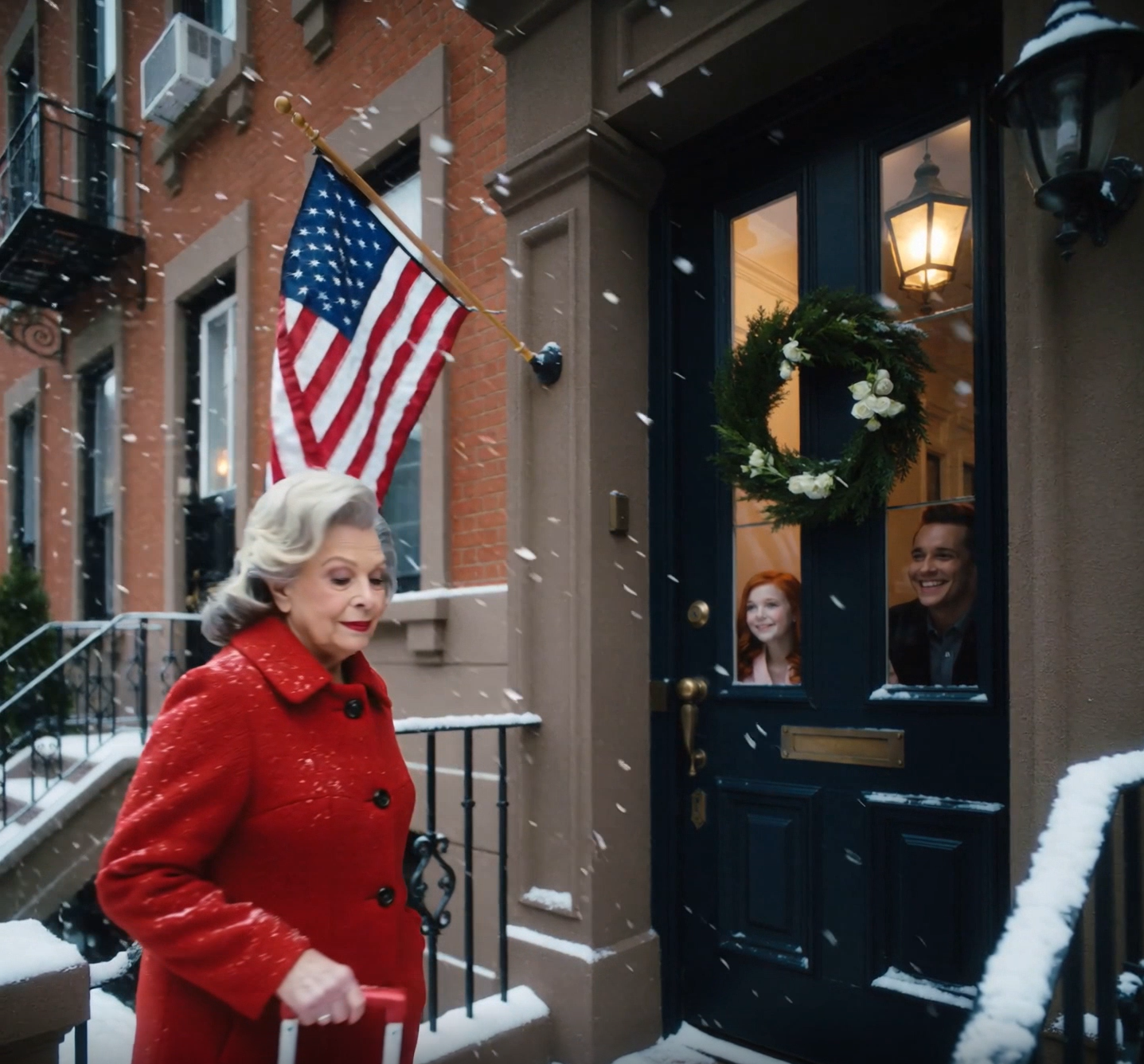 I stood on the porch holding the red suitcase in one hand and the tin of cookies in the other. The wreath on the door was fresh—pine and cranberry, elegant, expensive. A small plaque beneath the doorbell read, “The [their surname],” my son’s name, not mine.
