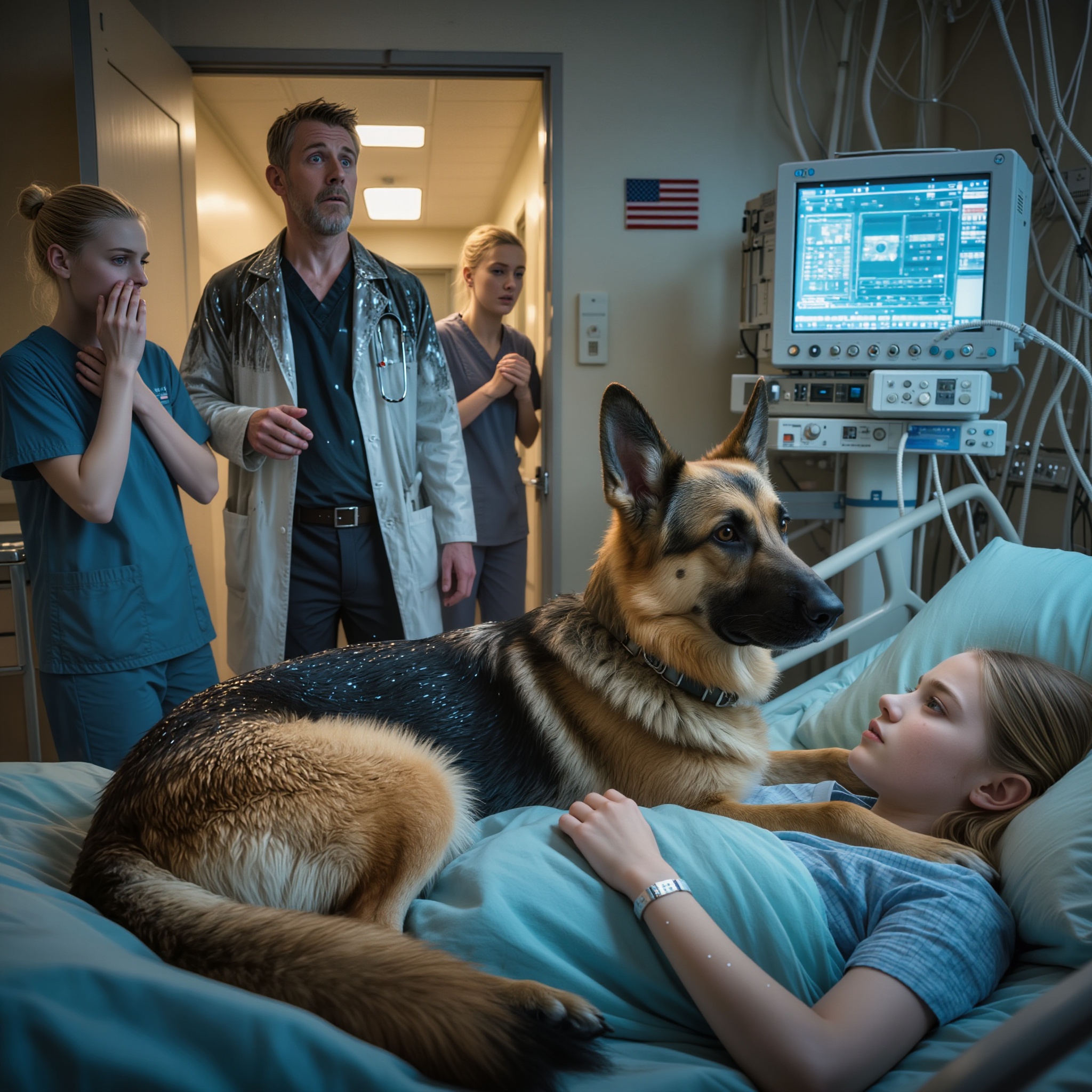 In the days that followed, the entire hospital seemed to change. Staff who once rushed through their routines now slowed their steps when they passed Room 217. Some stopped at the doorway, silent witnesses to a scene that remained the same day and night: a large German Shepherd lying across the bed of a fragile little girl.