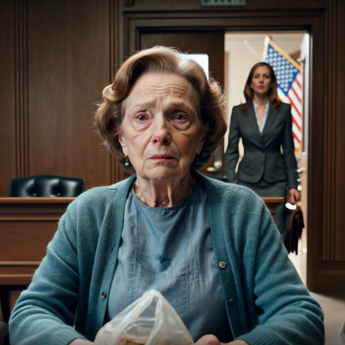 Eleanor Jenkins sat alone at the defendant’s table, her 72-year-old frame seeming to shrink beneath the weight of the moment. Her hands, spotted with age and swollen from arthritis, clutched a plastic shopping bag containing every document she owned in the world. She wore her Sunday best: a faded blue dress she had carefully hand-washed in a shelter bathroom sink the night before, and a threadbare cardigan that had once been her late husband’s. Her silver hair was neatly pinned back—dignity being the one possession she refused to surrender.