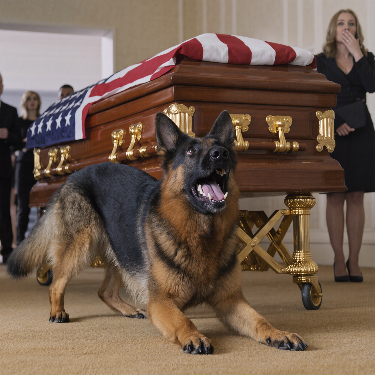 Not a lunge, not the senseless flinging of an untrained dog. A straight line toward the coffin—paws a rapid drum on the floor, the leash drawing tight, Carson’s shoulder wrenching. The floral arrangements trembled and spilled, white roses tumbling like snow around the casket stand. A woman cried out. Someone grabbed a child and pulled him close. Max came up on his hind legs, forepaws against the velvet skirting, nose pressed to the wood, and let loose a bark that felt like it came from the building’s foundation.