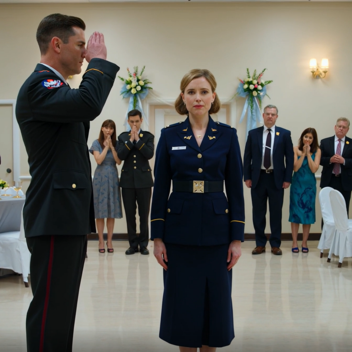 Andrew moved. Deliberate, not rushed. He walked the length of the room—past old commanders, academy friends, cousins in tailored suits. Each step echoed. He stopped one pace away and saluted. Sharp. Precise. The kind of salute you don’t give to a sibling or a friend or a joke. “Ma’am,” Andrew said, voice steady and carrying. “Please forgive my wife.” He turned to the room, still holding the salute. “This is Major General Rebecca Cole—my commanding officer.”