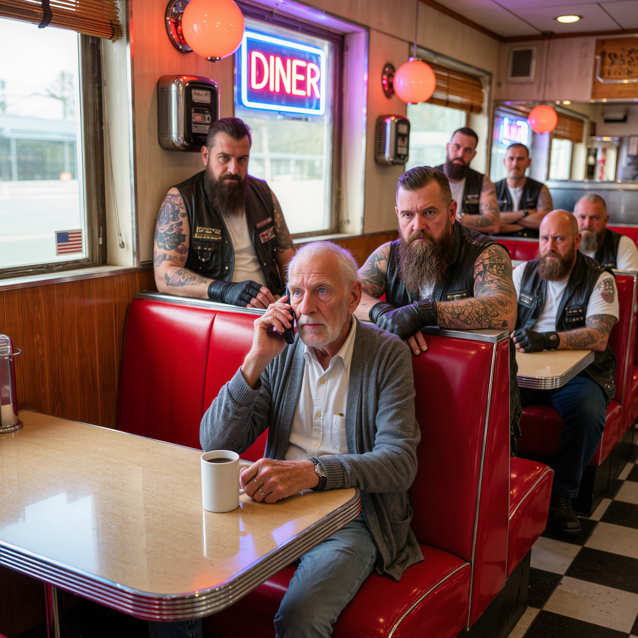 His words stopped as Walter’s hand moved—not in attack, but reaching slowly for his phone. The motion was deliberate, almost casual, but something about it made all five bikers tense. The sun climbed higher, casting the diner in sharp contrast. As Walter’s weathered fingers hovered over his phone, no one in Miller’s Diner could have guessed what they were about to witness: a lesson in respect that Millbrook would remember.