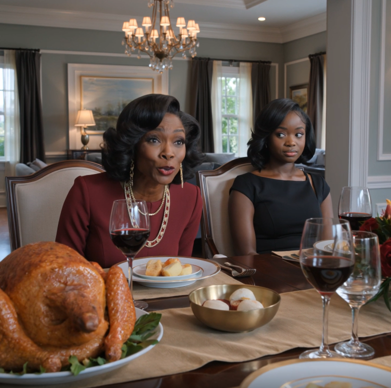 Reginald Wilson had built his whole life around entrances. Even in his own dining room he knew how to make a room wait for him. He tapped the side of his glass with a fork. The conversation died instantly. The chandelier above us glowed over polished mahogany, gold-rimmed china, and the kind of Thanksgiving spread meant to photograph well: cornbread stuffing in a white ceramic dish, green beans with fried onions, sweet potatoes with toasted pecans, cranberry sauce no one actually ate, and a tall vase of cream roses placed so nobody could fully see each other across the table.