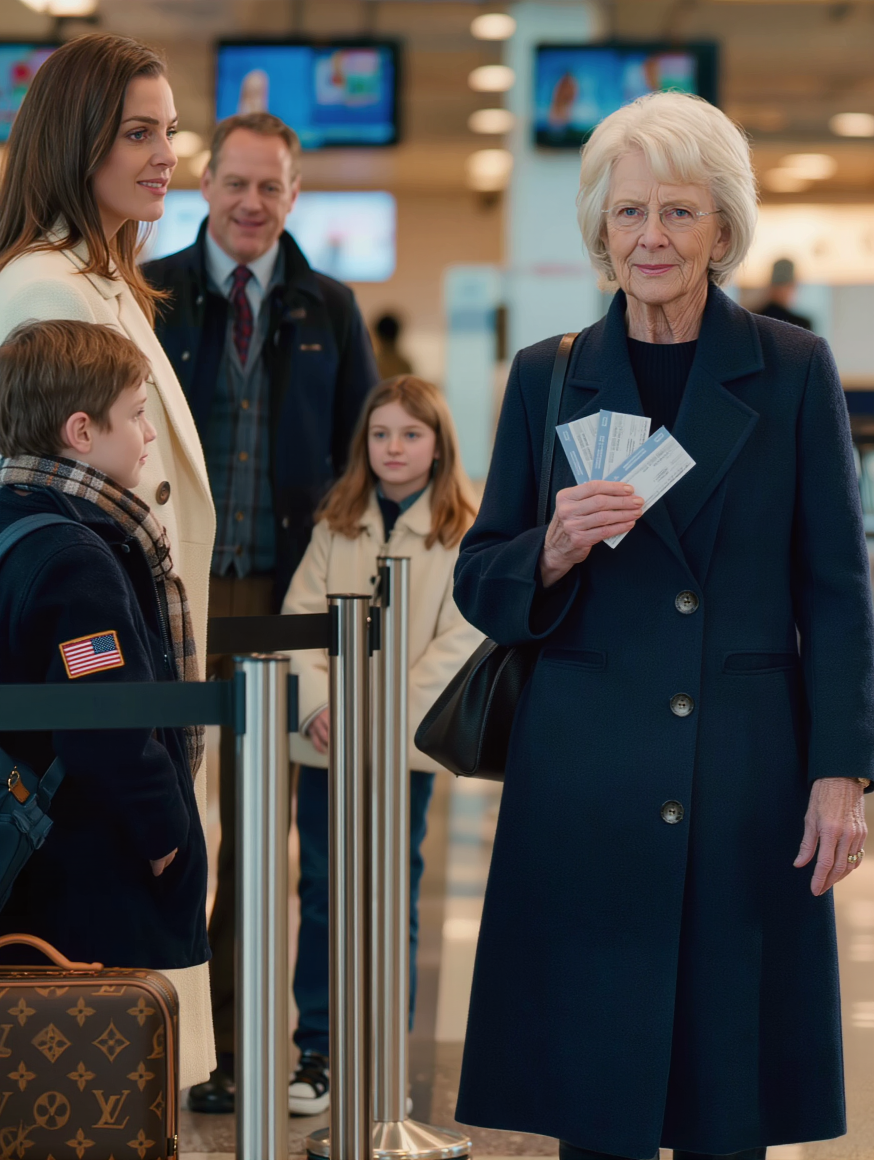 She stood near the premium line in a camel coat with perfect blonde highlights falling over one shoulder, her expensive luggage lined up beside her like obedient servants. Bradley stood next to her in a quilted vest and loafers, barely looking up from his phone. Emma and Lucas sat on their carry-ons, faces blue-lit by tablets. My grandchildren were beautiful children. Emma had Robert’s dark, thoughtful eyes. Lucas had Jennifer’s mouth and Bradley’s talent for seeming completely at home wherever he was placed.
