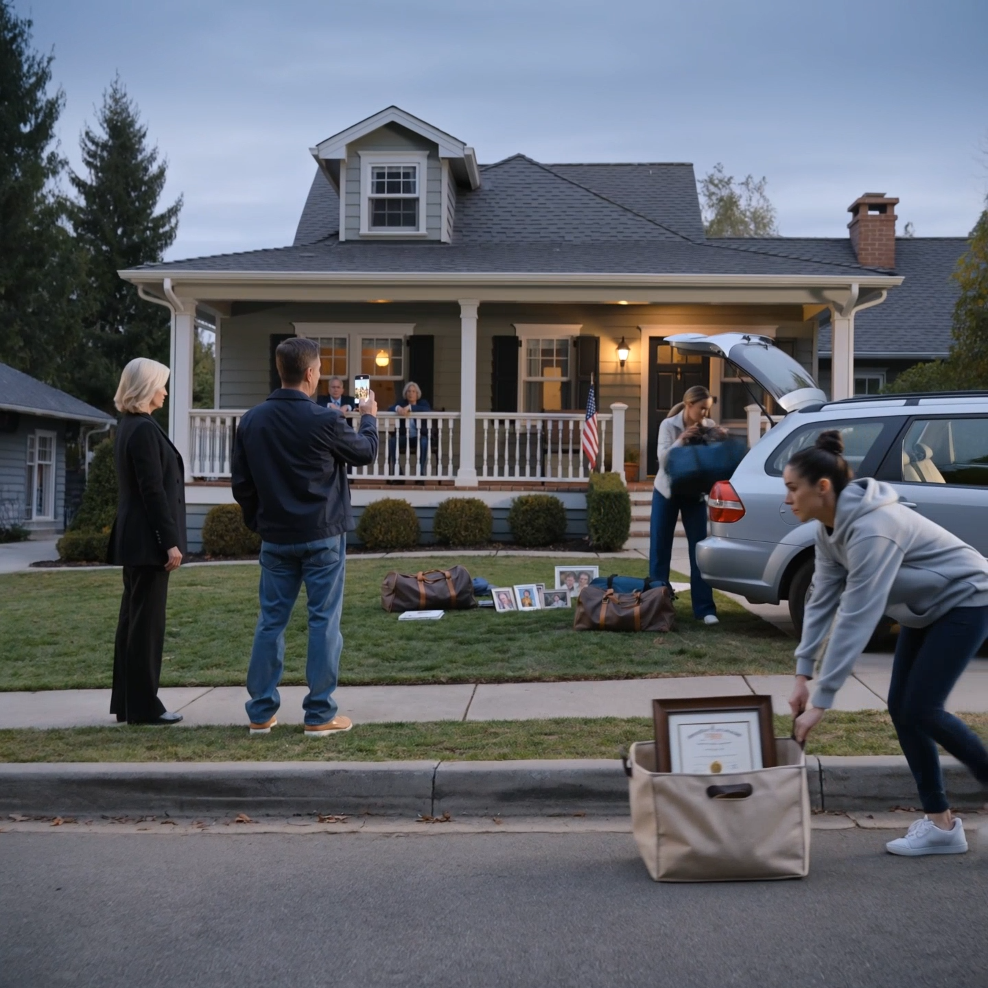 My mother was just behind him, arms folded so tightly it looked painful. My younger sister Tessa was sitting on the top step in leggings and a college sweatshirt, nudging one of my plastic bins with the toe of her sneaker. When she kicked too hard, a stack of framed certificates slid out and skated toward the curb.