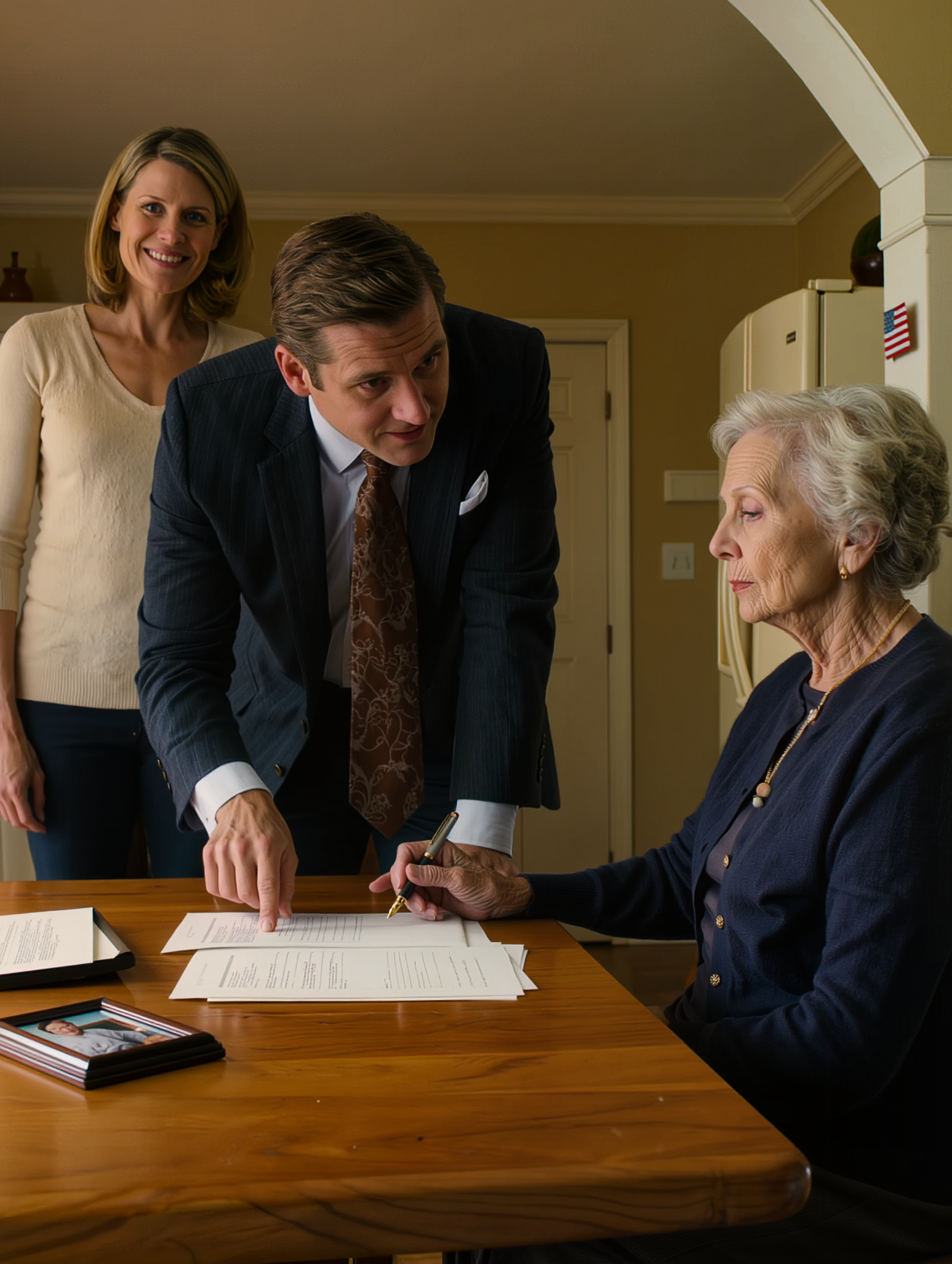 Mr. Peterson opened his portfolio and began arranging papers on my kitchen table with deliberate, practiced calm. There were folders with tabs. There were places marked in yellow. There was a black pen laid diagonally across the top page like a prop in a bad play.