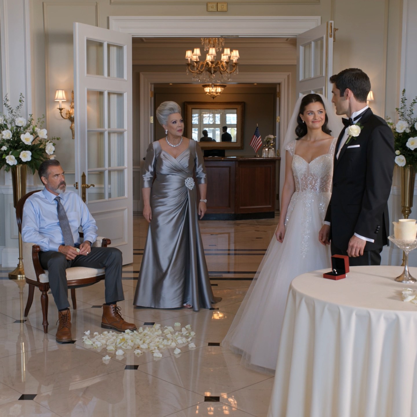 Monica’s niece, Nancy, the flower girl, had been fidgeting for fifteen minutes in her little ivory dress and patent shoes. She couldn’t have been older than six. Right when the best man reached for the ring box, Nancy dropped her petal basket and rose petals went skittering across the marble floor.