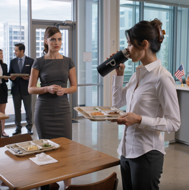 I understood it three years later, standing in the executive cafeteria of my own company in a plain white blouse from Nordstrom Rack, holding a black thermos I had personally ordered for my husband, when his secretary slapped me across the face and shouted, in front of half the building, “That’s my husband’s water. You dare touch it?”